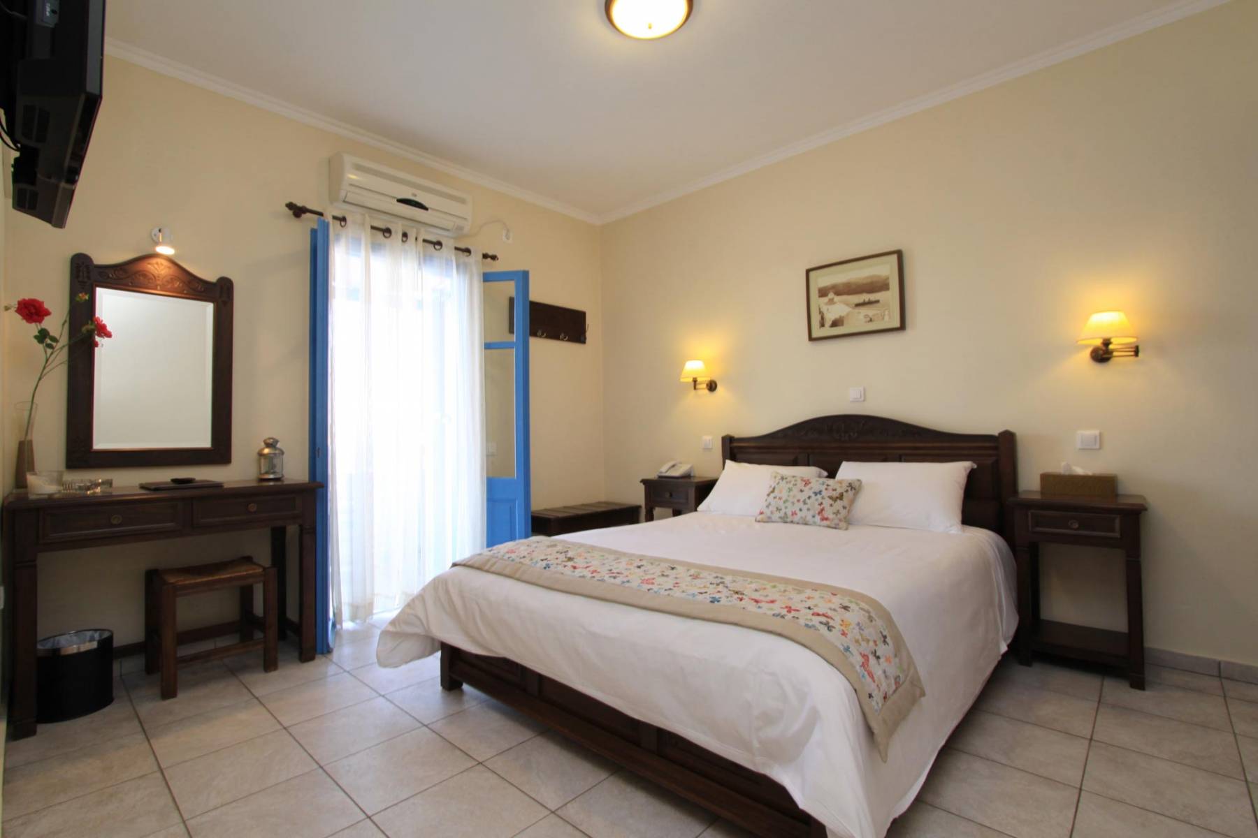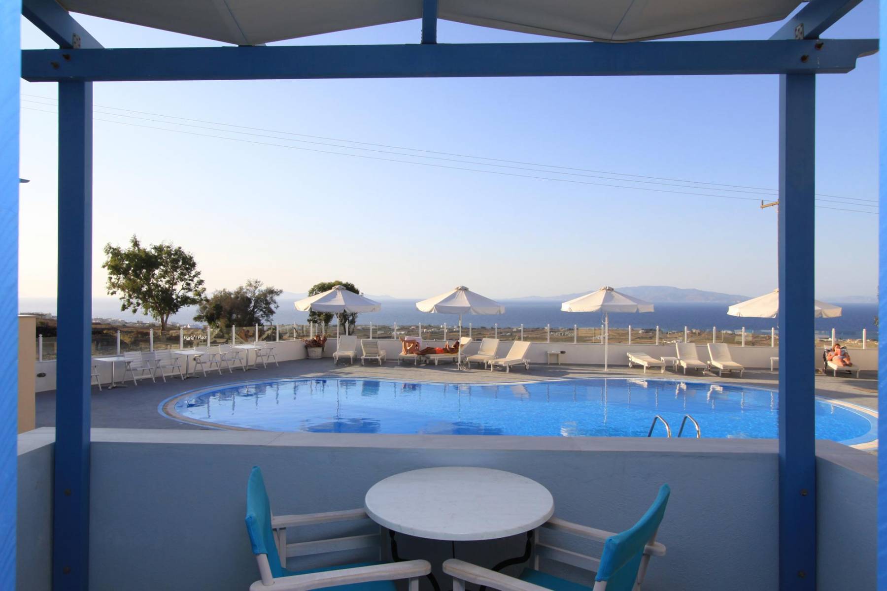 Is located next to the pool and you can enjoy your breakfast or at the evening your drink watching the surrounding islands and the unique sunset of Oia village.