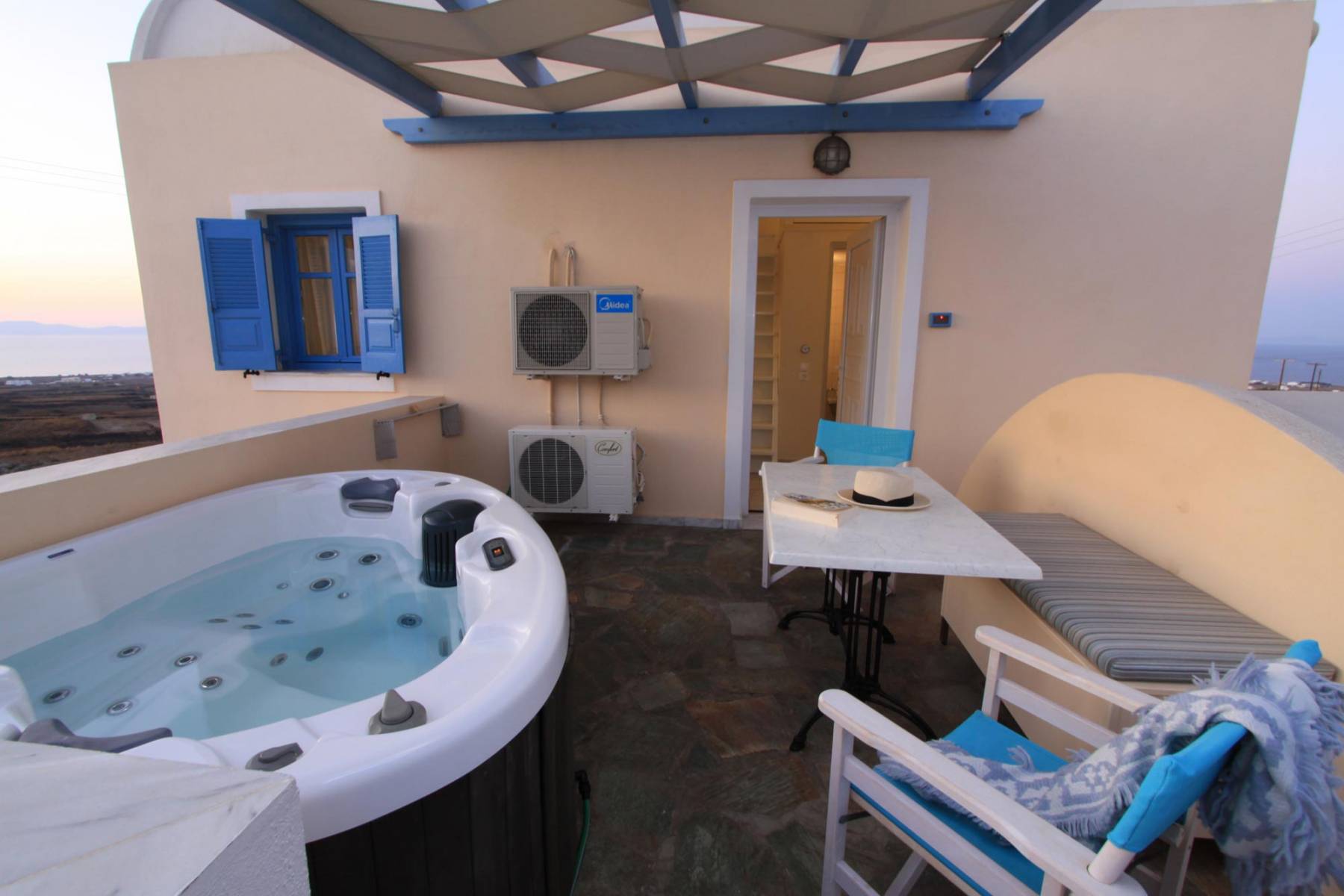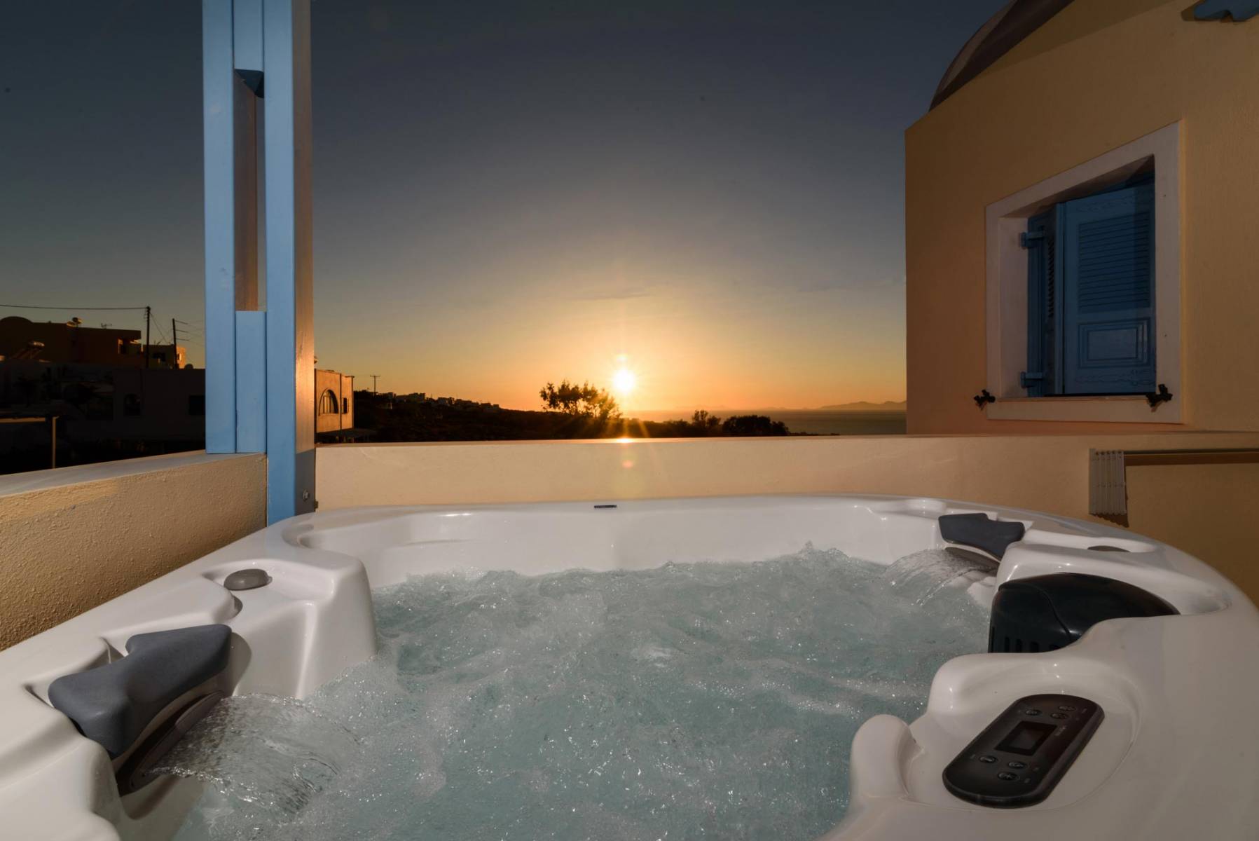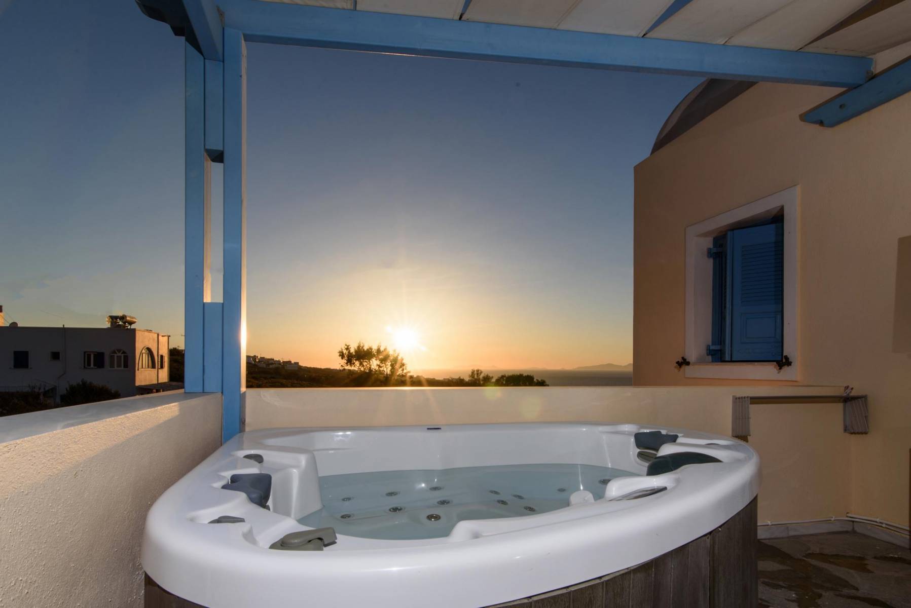 Is located next to the pool and has a veranda with hot hub and view to the unique sunset of Oia village.