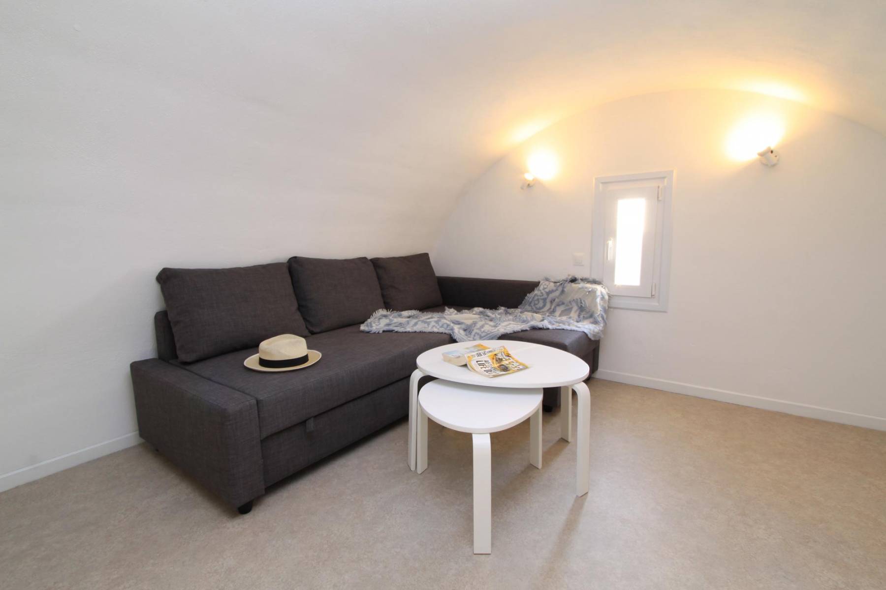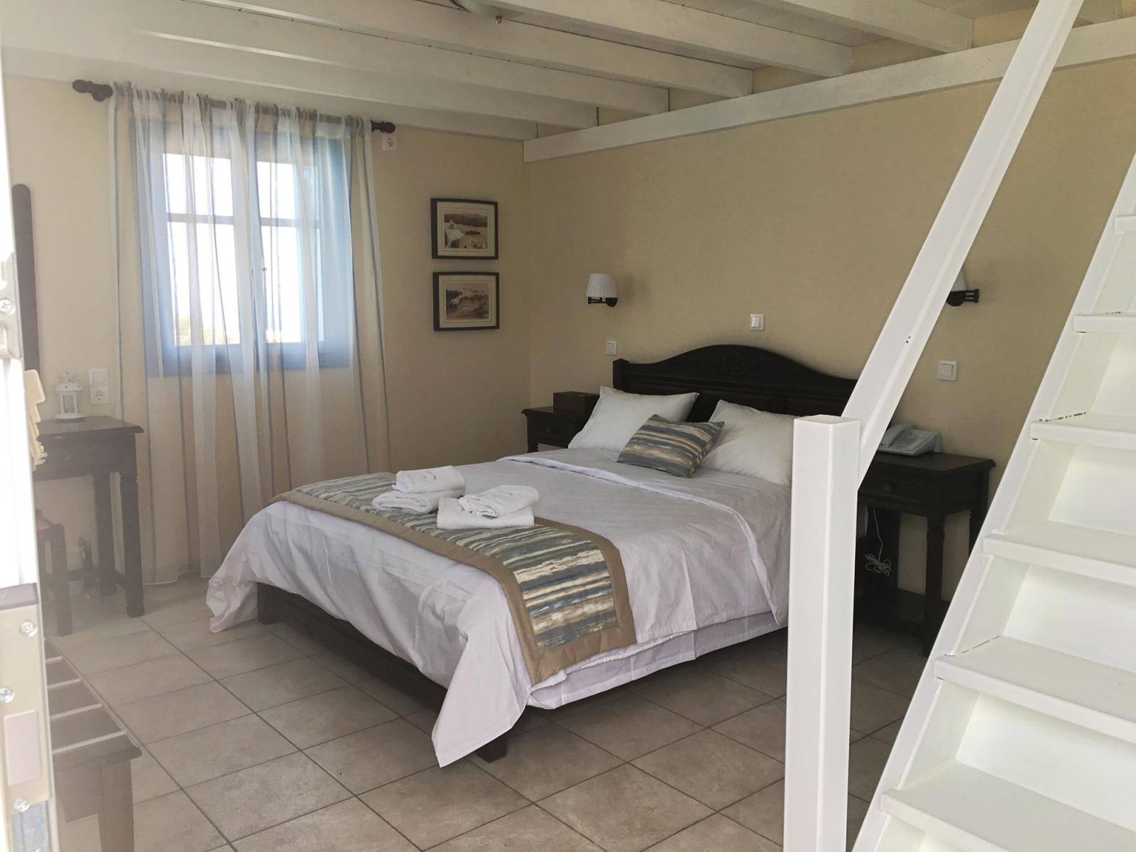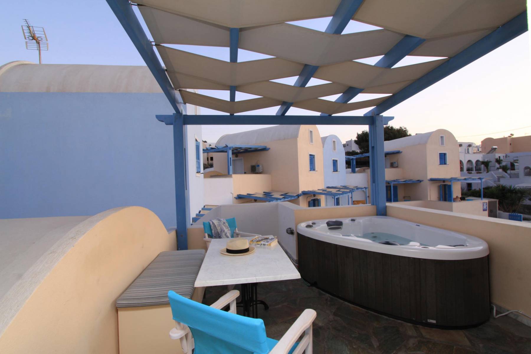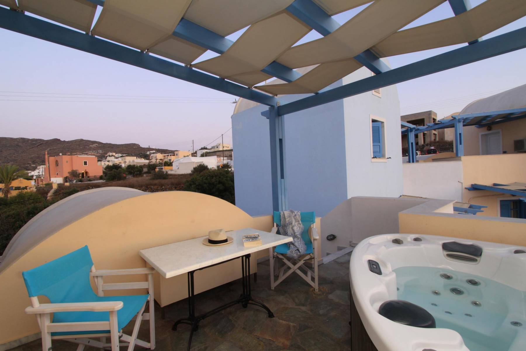 Is located next to the pool and has a veranda with hot hub and view to the unique sunset of Oia village.